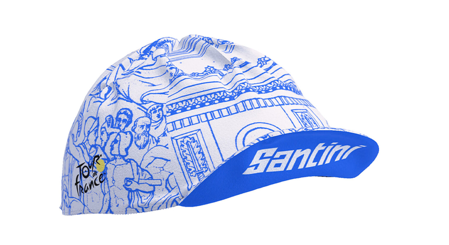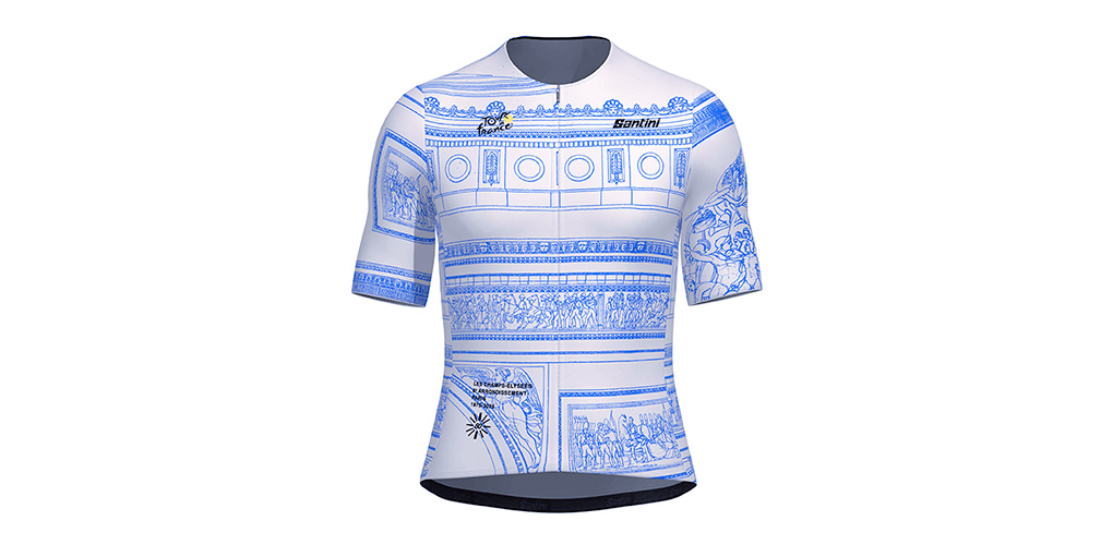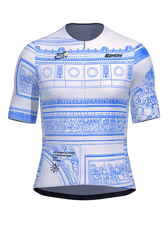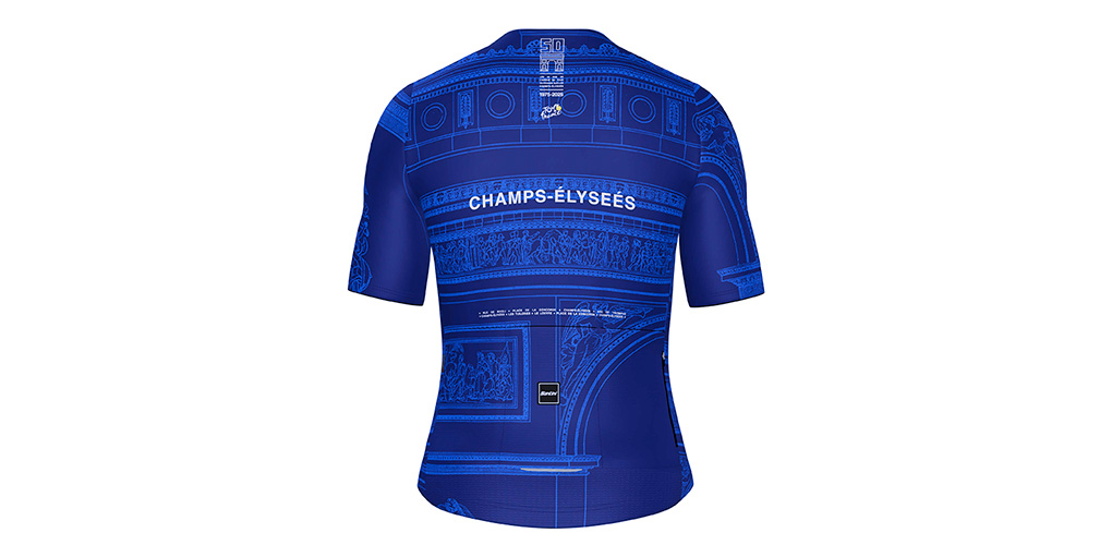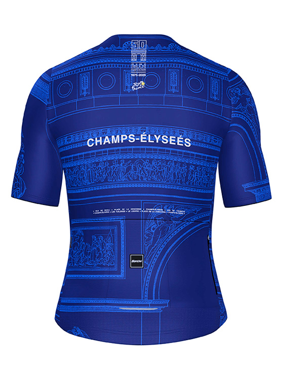 Per festeggiare i 50 anni dal primo traguardo del Tour sugli Champs-Élysées, Santini propone due kit esclusivi. Il primo, Arc de Triomphe, rende omaggio al celebre monumento parigino con una grafica elegante su maglia (in versione blu o bianca), pantaloncino e accessori coordinati.