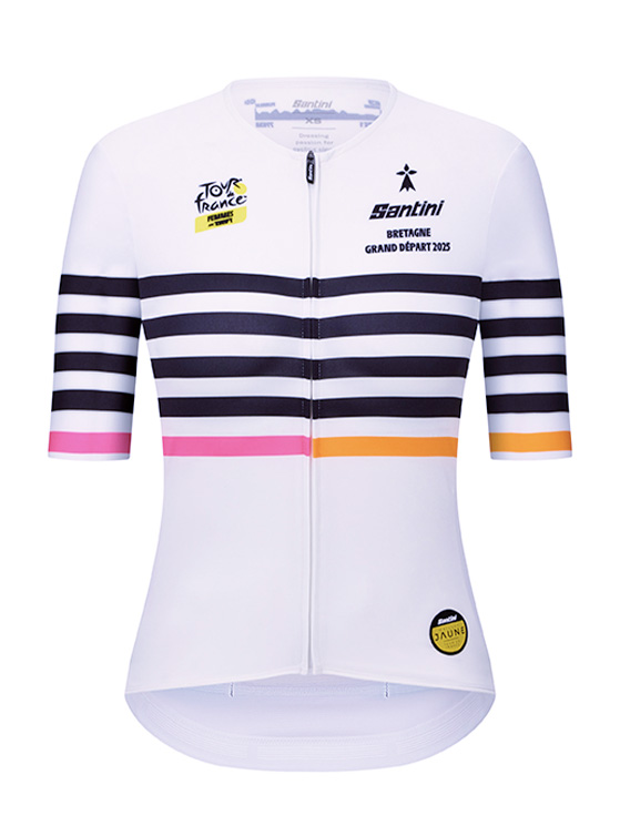 Il Grand Départ del Tour Femmes 2025 si terrà in Bretagna, e Santini lo celebra con una maglia ispirata alla bandiera bretone Gwenn ha Du. Bianco e nero dominano la grafica, arricchita da simboli culturali locali come l’ermellino e la bigoudène.