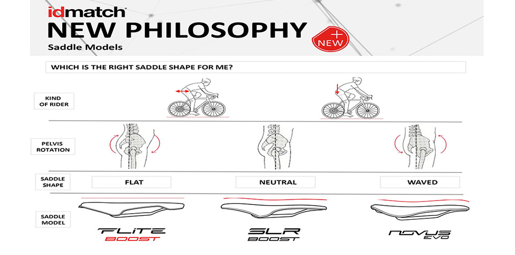 Selle Italia è un marchio che ha da sempre creduto nelle selle corte, in quanto richiedono un posizionamento più preciso sulla bicicletta che porta ad una pedalata più efficace. La nuova filosofia idmatch parte da due fattori: la rotazione pelvica e le abitudini in sella del ciclista. In pratica sono state individuate tre tipologie differenti di rotazione pelvica: anteriore, neutra e posteriore.
