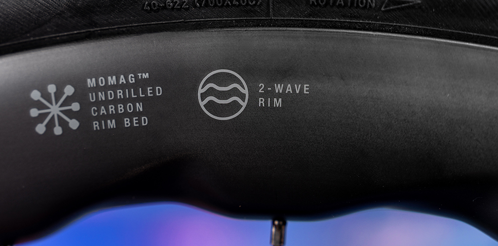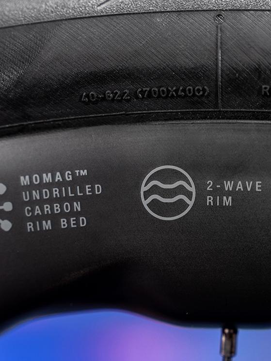 Torniamo perciò alla Soniq 42. Il cerchio è in carbonio e viene realizzato con una laminazione FF80, che permette alla ruota di non essere troppo rigida, amplificando il comfort per quando le uscite sono lunghe e i fondi misti. Il ponte non è forato, grazie al ricorso alla tecnologia 2-Way Fit, e questo consente di montare il tubeless facendo a meno del nastro.