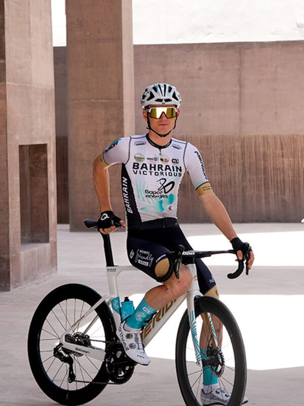 La colorazione con la finitura perlata è il punto di unione che ha coinvolto i diversi partner del Team Bahrain Victorious, così come l’azzurro e la colorazione oro. Per celebrare l’iniziativa Merida ha preparato i due modelli di bici usate dai corridori, Scultura e Reacto, con la livrea bianco-perla che adotta dei richiami azzurri ed il logo rappresentativo. Le scritte sono di colore oro e l’allestimento non prevede variazioni, con la trasmissione Shimano, le ruote ed il cockpit Vision, oltre alle selle Prologo. Allo stesso modo anche Elite ha prodotto le borracce che si intonano alle biciclette ed al kit di Alè Cycling.