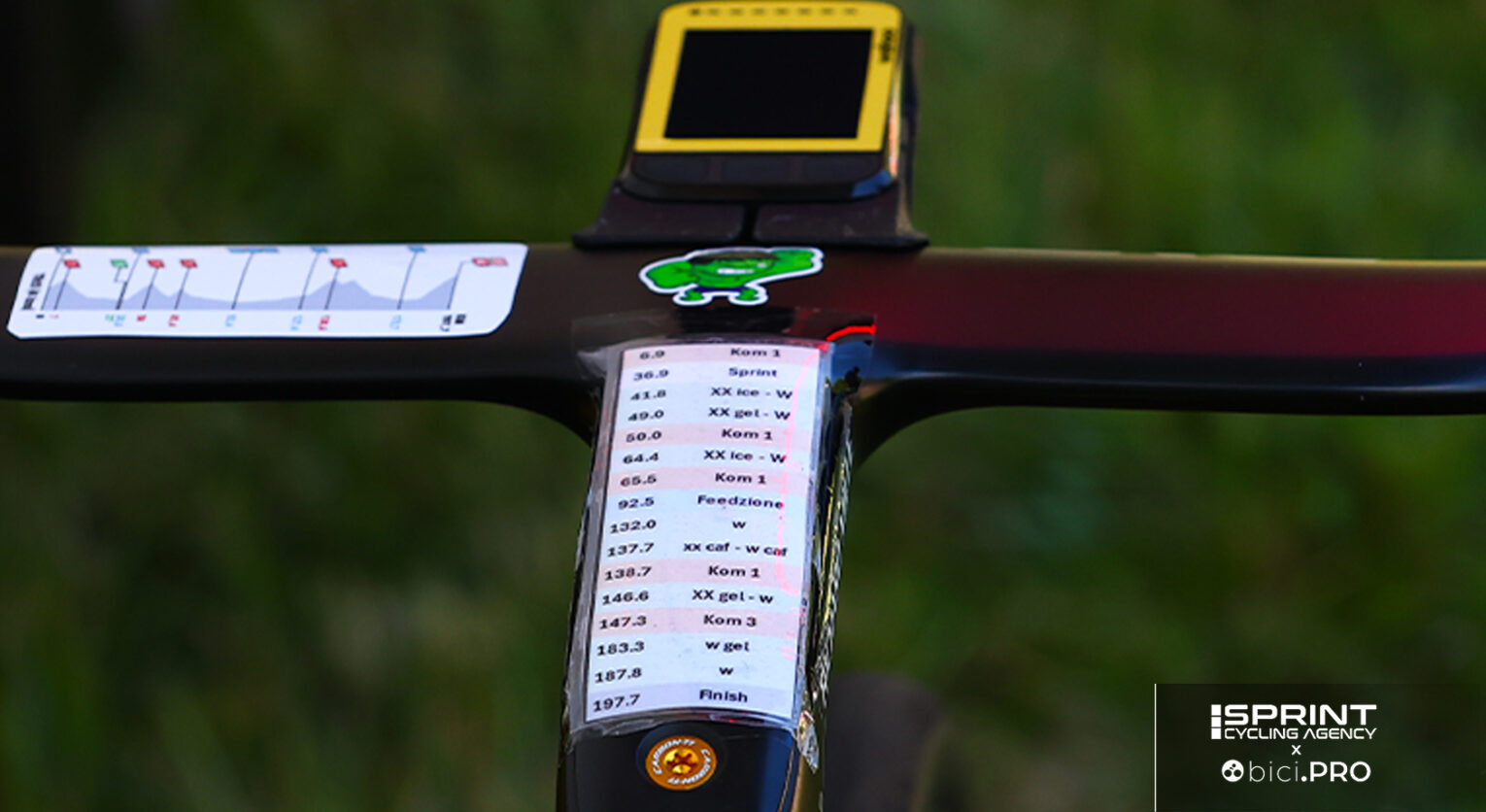 La tabella sul manubrio indicava i punti in cui mangiare, un utile memorandum per evitare qualsiasi imprevisto. Per dargli una forma che in qualche modo sia esplicativa per chi, come noi, va in bici ma non ha le gambe di Pogacar, abbiamo chiesto un commento a Paolo Calabresi, Direttore Marketing Sport & Fitness di Enervit.
