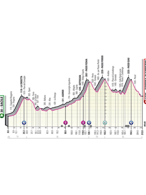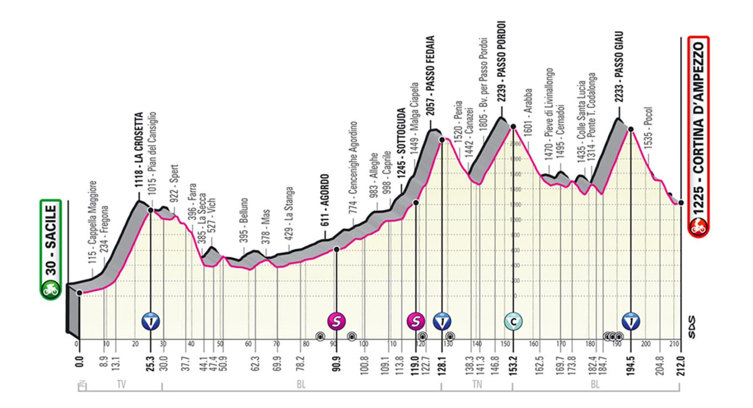 La Crosetta è la prima salita di giornata, inizia subito Il passo Fedaia è la prima delle tre salite dolomitiche del finale. Si scollina oltre i 2.000 metri Il Pordoi è la seconda grande scalata, ancora una volta si va oltre i 2.000 Il Giau ha le pendenze più severe di giornata ed è l’ultima salita