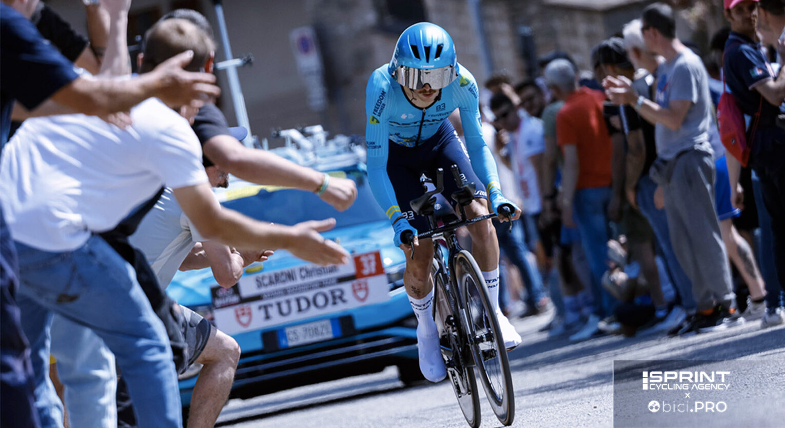 Noi intanto lasciamo la zona dei bus con l’ammiraglia. Prendiamo posto nella fila e ci mettono la targa col nome di Scaroni. Ci avviciniamo al percorso. Tramite un apposito ingresso tra le transenne, non appena sfreccia la maglia turchese di Christian, varchiamo quell’ingresso e ci mettiamo alla sua ruota.