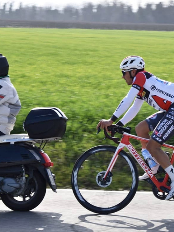 Il mercoledì faccio distanza: 5 ore, 5 ore e mezza. Vado verso gli Appennini. Faccio il Monte Busca, il Trebbio e d’estate mi spingo verso i valichi con la Toscana. Lì a 1.000-1.200 metri di quota è anche più fresco. Alla fine le mie distanze oscillano tra i 140 e i 170 chilometri. Stando da solo la velocità non è altissima. Poi il giovedì faccio scarico e il venerdì faccio 3 ore, anche 3 ore e mezza con il dietro motore. Adesso lo faccio con mio papà, Maurizio, altrimenti rubo l’ora di pausa pranzo alla mia ragazza. Ma di solito me lo fa fare Amilcare, un mio vicino di casa appassionatissimo. Lo chiami a qualsiasi ora del giorno e della notte e su di lui puoi contare. In questo periodo non sta bene, ma presto si rimetterà… e la pausa pranzo di Martina sarà salva!