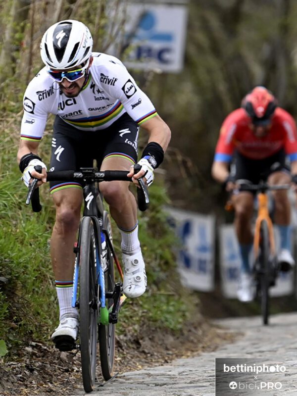 «Ma torniamo al discorso di prima: sono qualità che Alaphilippe già possiede. Pensiamo al mondiale: quando è scattato lui gli altri sembravano fermi. E anche il lavoro sul passo è buono. A Leuven nel finale andava via di 53×12 a 52-53 all’ora dopo aver superato il muro dei 250 chilometri».