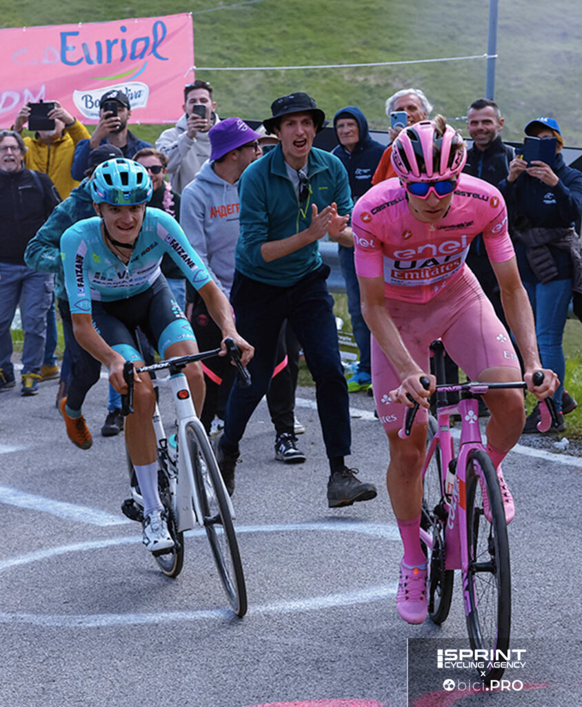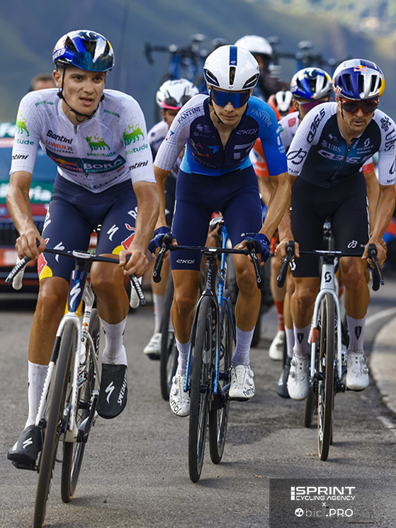 In quello successivo, El Ferial Larra-Belagua, già più complicato, Giulio ha iniziato a mettersi in evidenza, correndo in appoggio per Jai Hindley. Su questa scalata, con pendenza media del 6,1 per cento, Pellizzari era rimasto con il gruppo dei top rider.