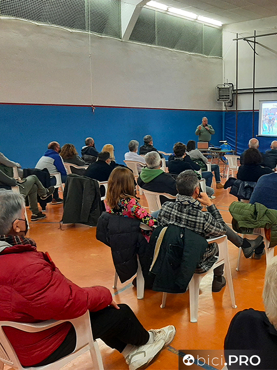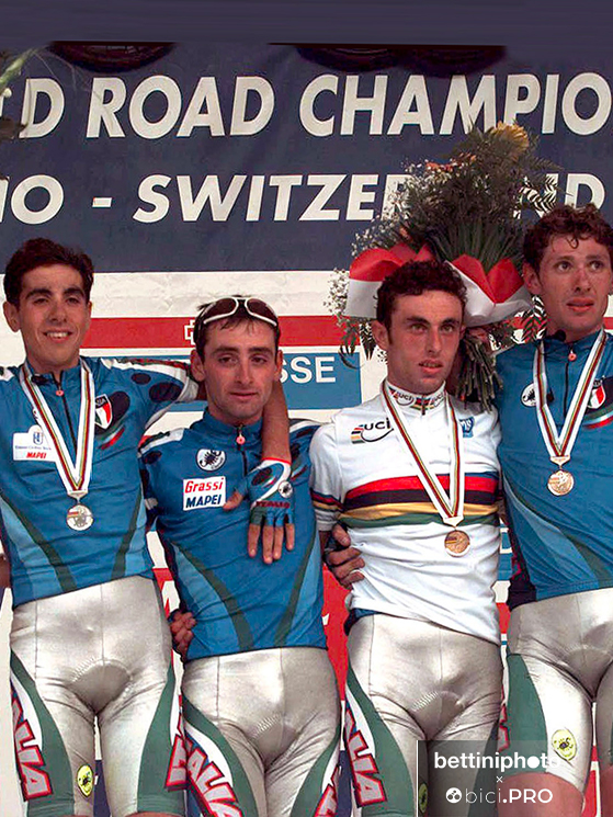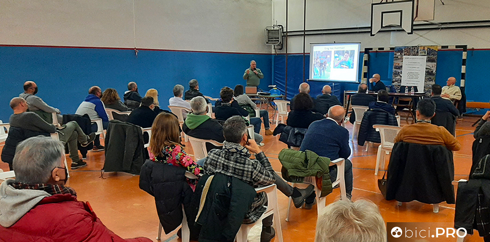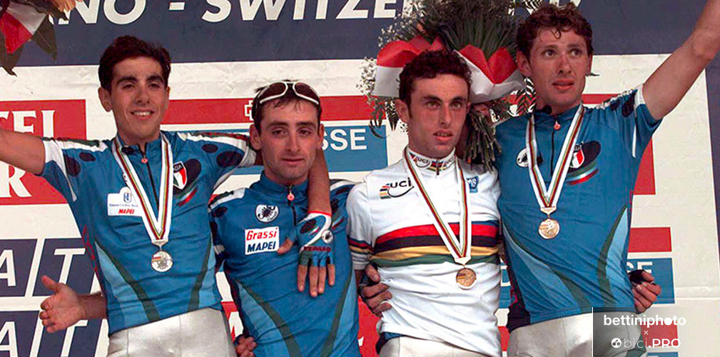 Scorrono le slide, le nozioni e i consigli sono preziosi. I ragazzi, i genitori e gli allenatori seduti sono attenti e interessati. Compare sul telo del proiettore una foto emblematica. Un podio del campionato U23 del mondo totalmente dominato dall’Italia. Lugano 1996, primo Giuliano Figueras, a seguire Roberto Sgambelluri e Gianluca Sironi. L’unico senza medaglia, al quarto posto, con sguardo pensieroso, è Paolo Bettini.