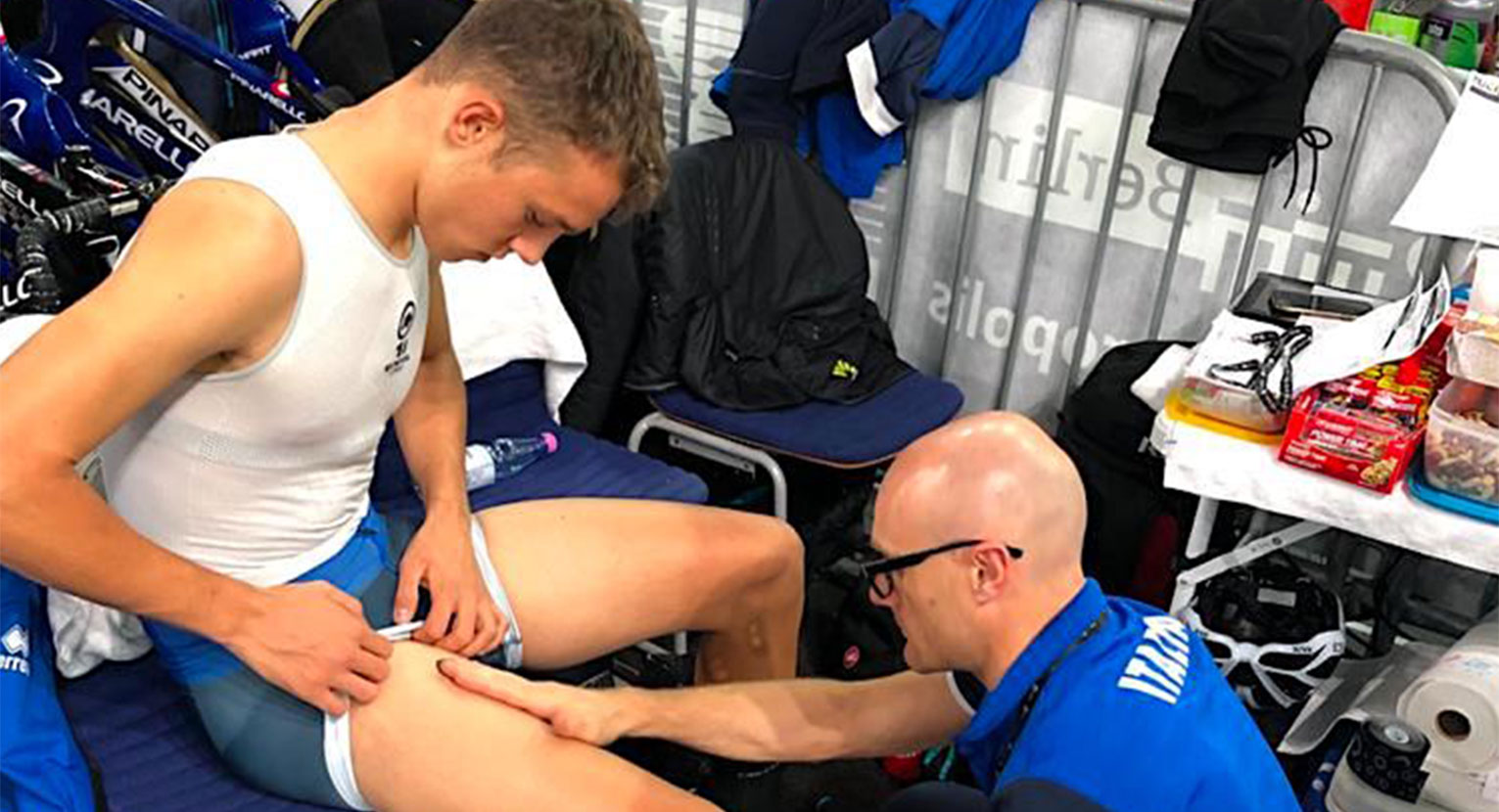 «Oggi il massaggiatore non tratta solo i muscoli. Deve saper ascoltare (Fred ha anche una laurea in psicologia, ndr) perché i ragazzi si confidano e magari sentendoli parlare capisci meglio di cosa hanno bisogno. Prima della crono iridata, mentre eravamo già sul bus, Ganna mi ha chiesto un trattamento diaframmatico. Lui scherza è giovane, ma è un vero campione anche in questo. Stava bene, ma un po’ di tensione ce l’aveva, era pur sempre un mondiale. Aver richiesto un mio intervento in quel momento è un attestato di stima. Mi lascia qualcosa sia sul piano lavorativo che su quello emotivo. Pippo avrebbe vinto comunque, ma mi piace sapere che un piccolo aiuto l’ho dato. Con quei 20′ di manipolazione si è rilassato e ha aperto al massimo i polmoni».