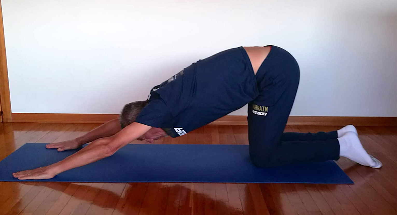 Essendo anche uno scarico mentale, bisognerebbe prediligere ambienti silenziosi, con luci basse… devi riprenderti il tuo corpo. Per questo sarebbe meglio riuscire a farlo durante le frenesia delle corse a tappe, quando fra trasferimenti, bus, hotel… non c’è mai tempo. Lo dico ai miei ragazzi: mentre aspettate per il massaggio fate questi esercizi. Si tratta di 20-25′ in tutto. Un tappetino non dovrebbe mai mancare nella valigia di un pro’.