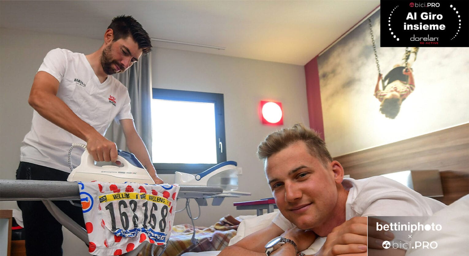 Gli hotel sono stabiliti dall’organizzazione, che cerca a fine Giro di assegnare lo stesso numero di “stelle” in totale per ogni team. Cuoco e massaggiatore raggiungono l’albergo subito dopo la partenza per predisporre le camere: alcuni team portano propri materassi, alcuni corridori hanno con sé i cuscini di casa, si fa di tutto per riposare al meglio.