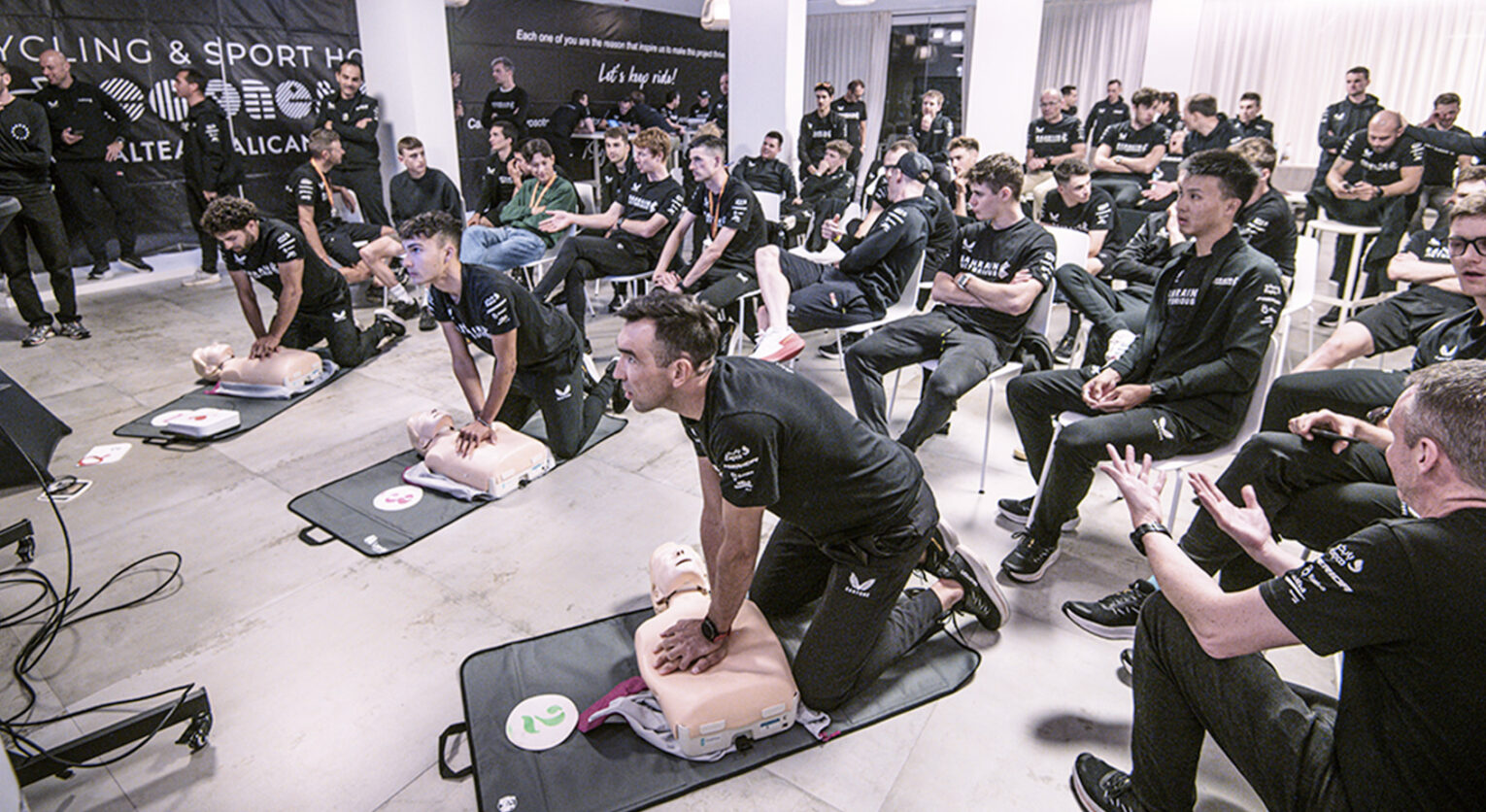 Durante il training camp ad Altea la Bahrain-Victorious. non solo si è allenata, ma ne ha approfittato anche per fare una lezione particolarissima ai suoi atleti e non solo. Lo staff medico, guidato dal dottor Daniele Zaccaria ha organizzato un corso di primo soccorso per defibrillatore (BLS-D).