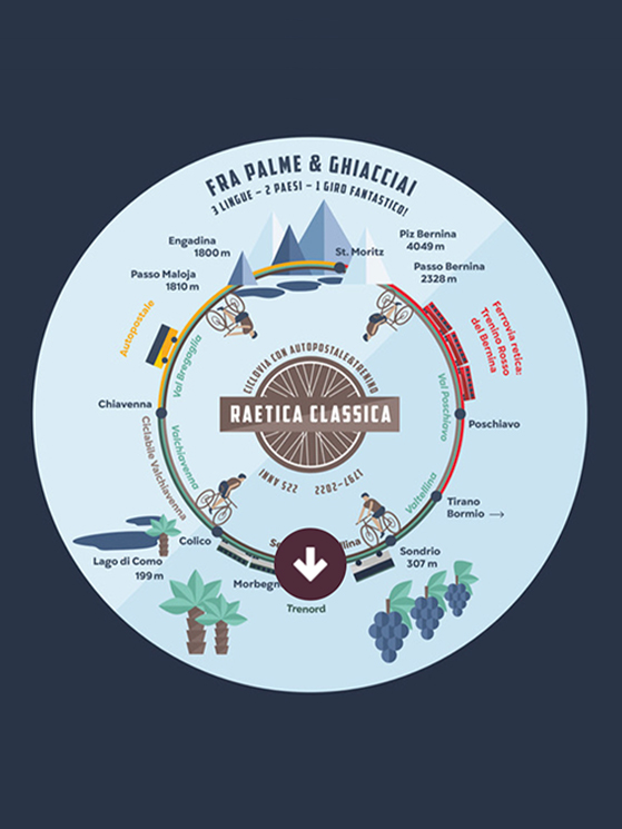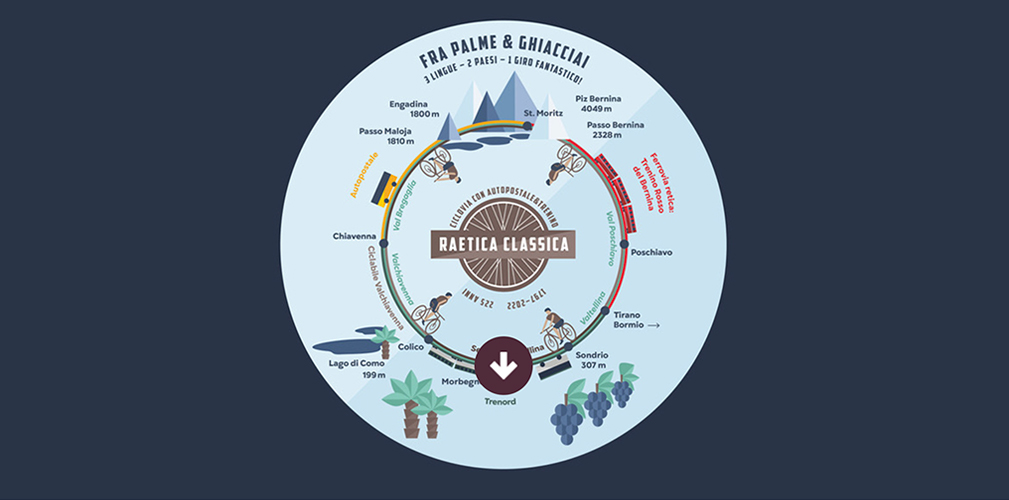 La Raetica Classica è un circuito ad anello che collega St.Moritz e l’Engadina con la Valtellina attraverso il passo del Maloja. Un binomio che unisce e va oltre i confini amministrativi di Svizzera e Italia. Il percorso inizia in Val Bregaglia, conosciuta per il castagneto coltivato più grande d’Europa, prosegue in Valtellina e termina nel Cantone dei Grigioni, nella regione Maloja.