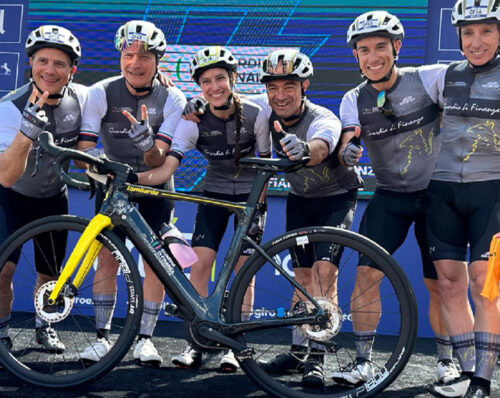 Uno squadrone, ma anche le altre formazioni del Giro-E non scherzano ed è bello ritrovare colleghi, amici, ma soprattutto tanti campioni del pedale, a partire dall’ultimo italiano capace di farci commuovere per una monumento tra fango e lacrime: Sonny Colbrelli. Stavolta, la festa gliela facciamo noi perché è anche il suo 33° compleanno e così a cantargli tanti auguri sono Andrea Tafi, Damiano Cunego, Sacha Modolo, Giovanni Visconti, Daniele Colli e Davide Cassani: alcuni dei protagonisti di questo Giro-E 2023.
