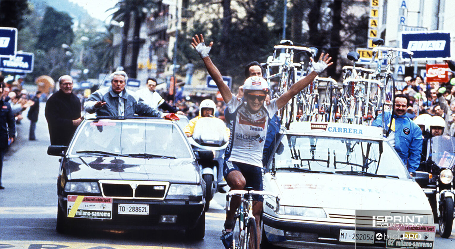 Beh, nascosto relativamente perché sapevano che comunque avrei preparato una Sanremo di quel genere. Non sapevano esattamente come e dove sarebbe nata un’azione. L’attacco sul Turchino colse tutti di sorpresa, partendo un po’ più da lontano, più lontano del solito mio. Mancavano 140 chilometri, pioveva come mai, insomma pensarono che non ce l’avrei fatta.